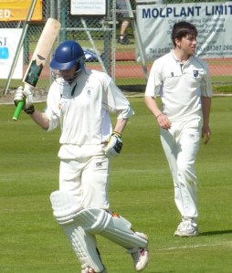 The GHK innings started well for Nunholm with McCutcheon, second ball, darting the ball back to bowl a batsman who was leaving the ball. However S Ahmed came in and hit the ball straight effectively for a rapid 36 before departing to Davidson’s first ball.The score was increasing steadily at four an over as decisions didn’t go the way of the bowlers and as chances weren’t taken in the field. The opener Kamran had started very circumspectly but upped the pace in partnership with Mackay. When the latter was out caught by keeper Cross off McCutcheon GHK were exactly halfway on 126 for 3 with 22 overs left.