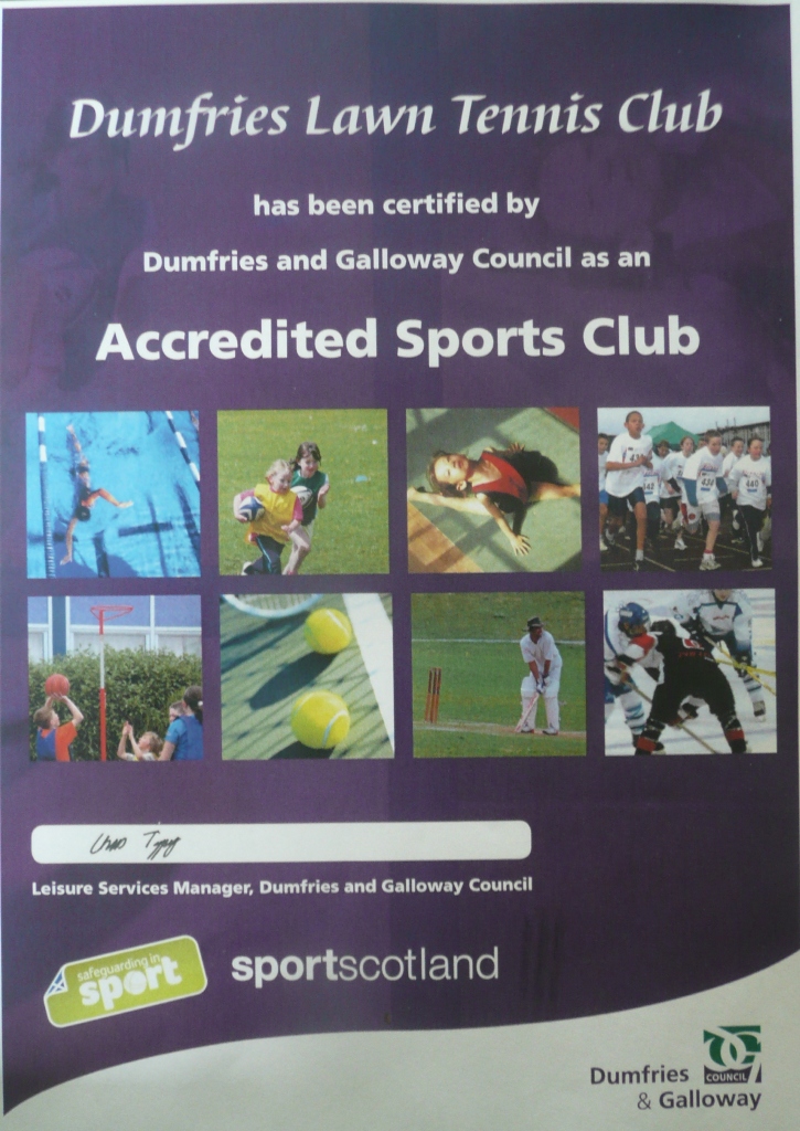 Dumfries Tennis Club has become the first tennis club in the area to receive the prestigious “Accredited Sports Club” status which means that Dumfries & Galloway Council have approved and supports the tennis programmes that we deliver on court and the policies and procedures that we have in place off court.