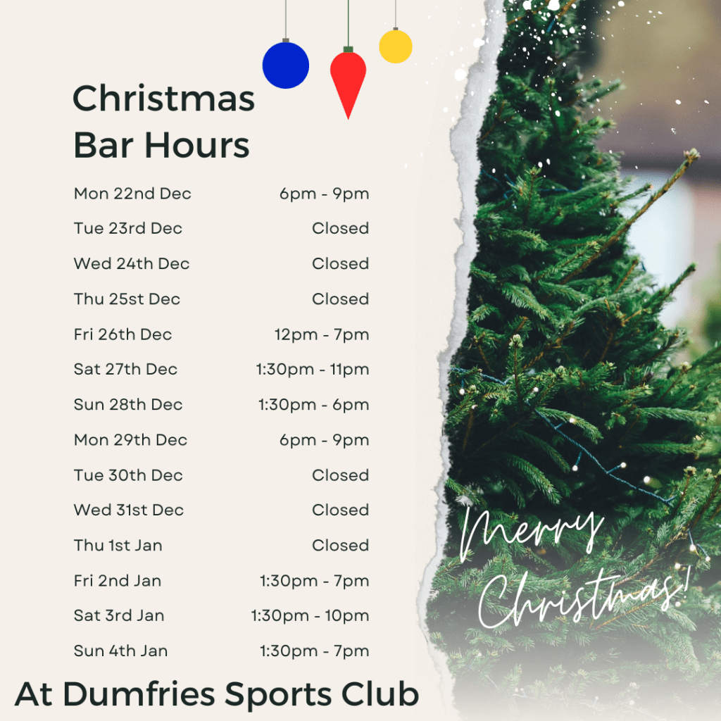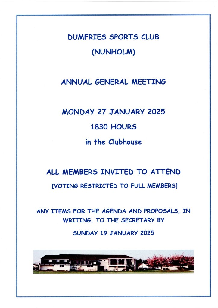 The Dumfries Sports Club’s 2024 AGM will take place on Monday 27th January at 6:30pm in the Sports Club.